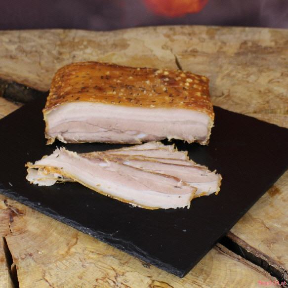 Nach dem Salzen und Würzen wird das Bauchfleisch gekocht, entbeint und anschließend mit Heißluft gebraten. Das Ergebnis: eine goldbraune, knusprige Schwarte und zartes, würziges Fleisch – kalt ein Hochgenuss!
